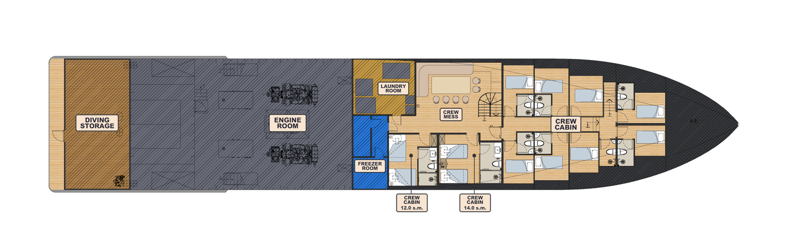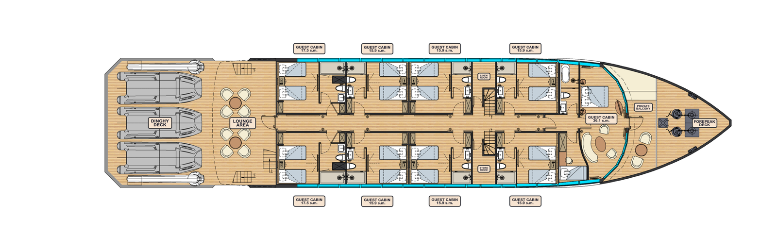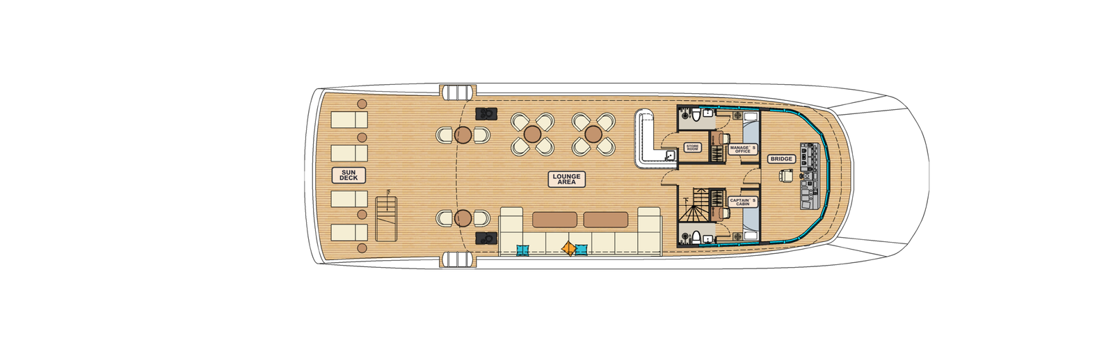 Accommodation includes ensuite and twin share cabins with basic room amenities, while the sun deck provides additional outdoor seating and sun beds.