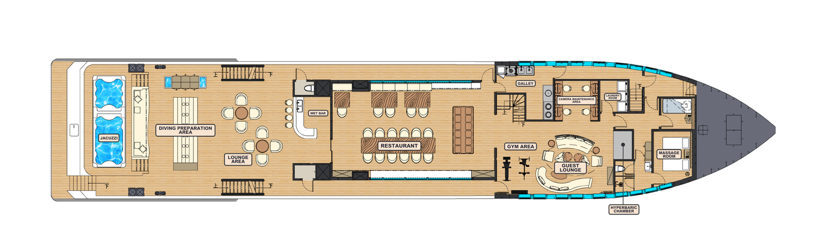 The vessel offers guests comfort, convenience, and entertainment through various amenities, such as outdoor seating, a whirlpool, two bars, an indoor dining area, gym area, spa room and a camera center.